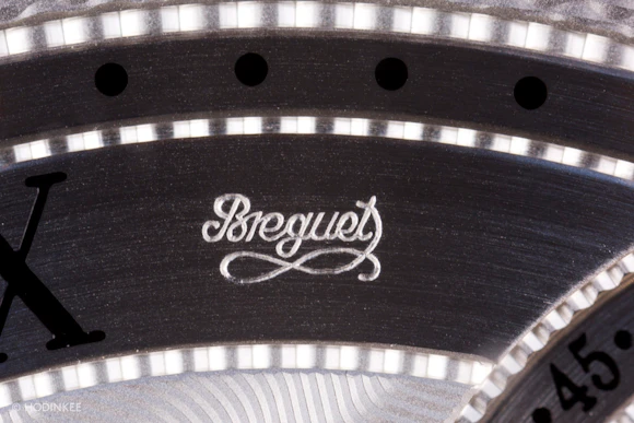 Das Zifferblatt ist verzieren, wie wir es von Breguet erwarten. Für mich könnte es sogar zu verzieren sein. Sechs verschiedene handgedrehte Guilloche-Muster auf einer Uhr dieser Größe sind eine Menge. Fügen Sie das dem versilberten Ring hinzu, zwei nicht so geheime Signaturen und ein paar überflüssige Beschriftungen (ich sehe Sie "10 Hz") und Sie haben ein sehr beschäftigt Zifferblatt. Es ist sicherlich ein beeindruckendes Zifferblatt, aber nicht zu vergessen.